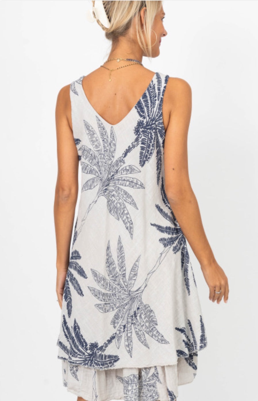 The Camila Palm Print Dress captures an easy, coastal elegance with a silhouette that moves beautifully through the day. Crafted in a lightweight, breathable fabric, it drapes softly while the layered hem adds subtle dimension and flow. The palm print brings a relaxed, vacation-ready feel, balanced by the grounded taupe base and deep navy detailing.