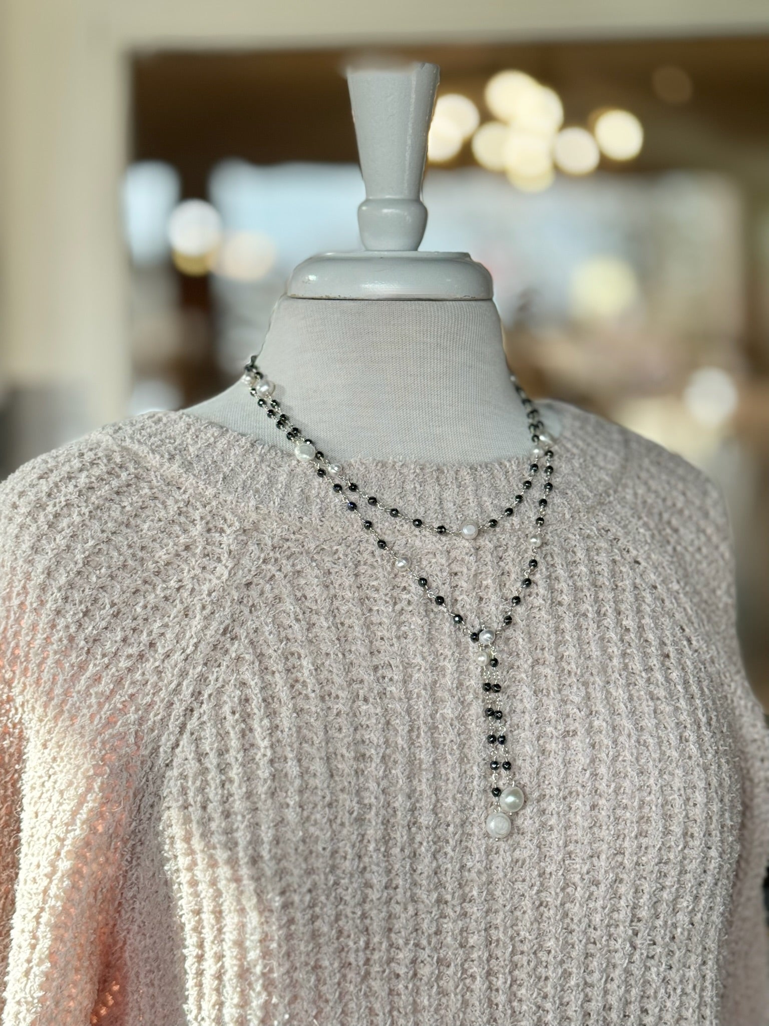 This versatile piece can be worn doubled, wrapped, or styled as a dramatic single strand. The adjustable design allows it to be clasped at any length, making it as effortless with a turtleneck as it is with an open neckline. The sterling silver wirework and Y-drop silhouette add refined movement and polish.