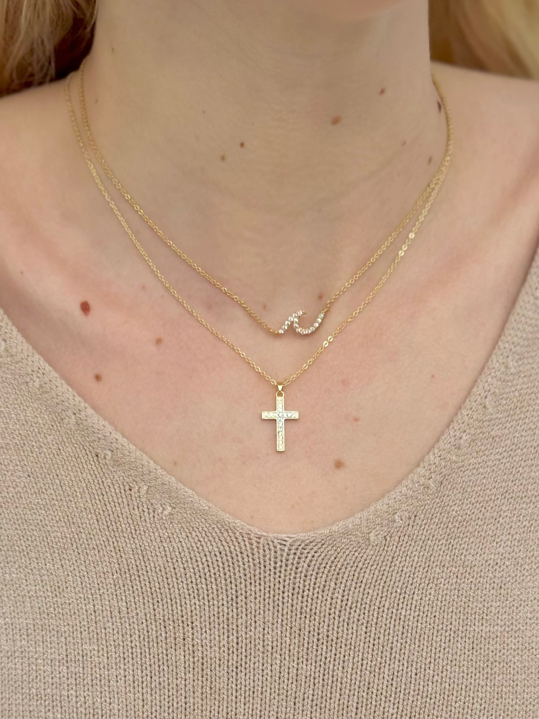 Timeless and delicately luminous, the Lila Gold Cross Necklace offers a refined take on a classic symbol. A slender gold cross is accented with subtle crystal detailing, catching the light with a soft, understated shimmer. The clean lines and balanced proportions make it feel meaningful yet effortlessly wearable.