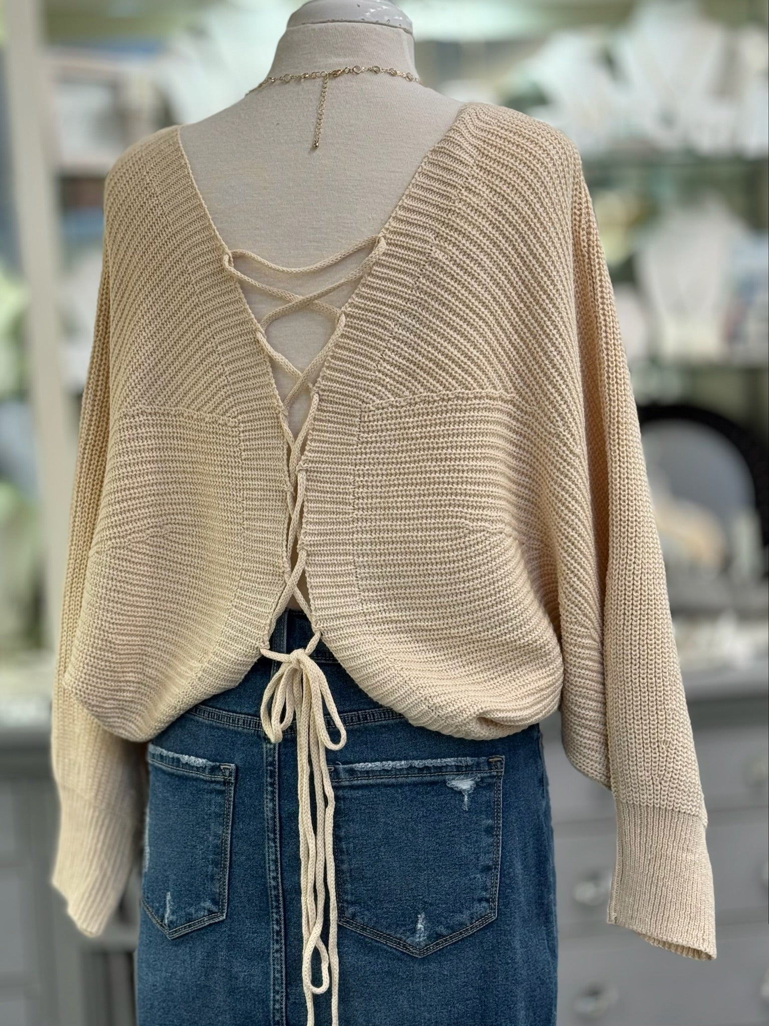 This stylish sweater features a relaxed fit with a boatneck front and a statement lace-up back detail that adds a playful yet sophisticated touch. Its versatile design ensures a flattering look from every angle, perfect for layering or wearing on its own. The textured knit gives it a unique finish, blending comfort with effortless style.