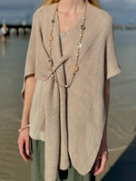 The asymmetrical wrap front creates an easy, flowy shape that flatters without clinging. The soft beige tone blends seamlessly with linen, denim, or neutrals you already love, making it one of those pieces you reach for again and again. Its versatility means you can style it loose and open, or gently gathered at the front for a more intentional, layered look. Light, packable, and seasonless, it’s the kind of throw-on piece that instantly pulls an outfit together without feeling overdone.