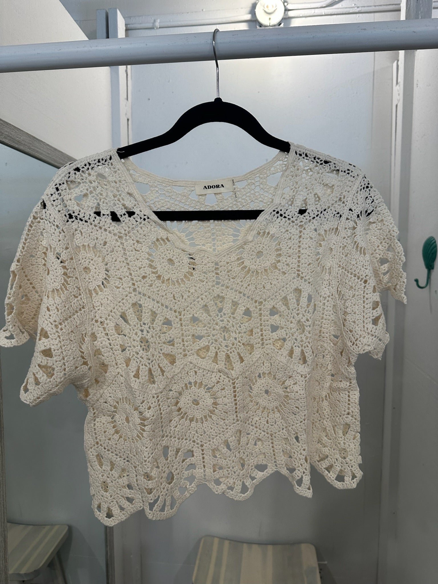 Add a touch of effortless charm to your wardrobe with the Emma Crochet Short Sleeve Top in Beige. Featuring an intricate open-knit floral pattern and scalloped hemline, this lightweight top blends boho elegance with everyday comfort. The soft cream hue pairs beautifully with everything from denim to flowy skirts. Finished with a flattering scoop neckline and short sleeves, it’s perfect for warm days or layering over your favorite camis.