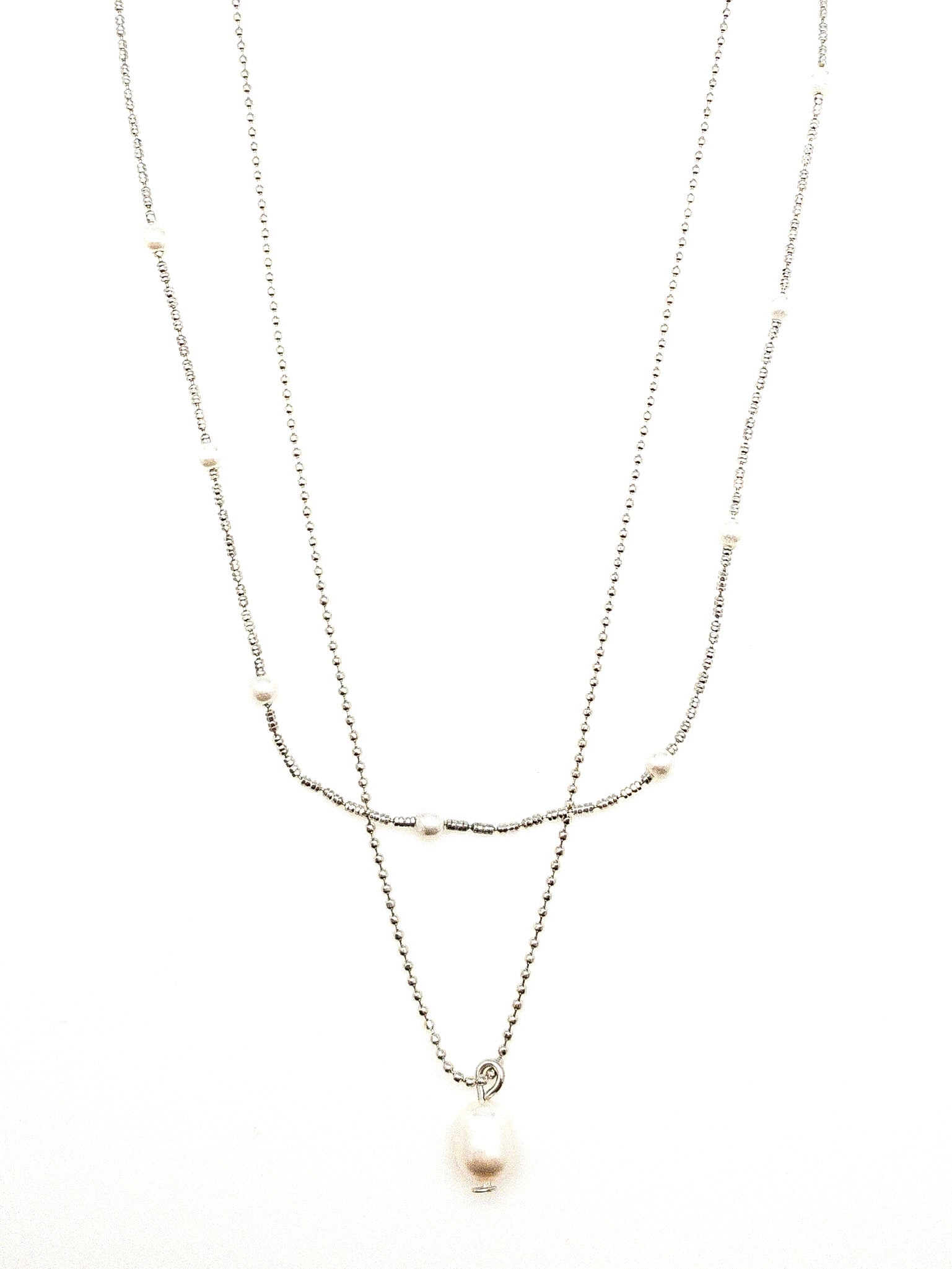 The Chandler Necklace is a delicate layered necklace featuring two fine silver chains. The shorter chain has small, evenly spaced pearls, adding a subtle touch of elegenace , while the longer chain holds one larger pearl. The combination of minimalistic silver chains and pearls create a timeless, graceful look that can either be casual or formal.