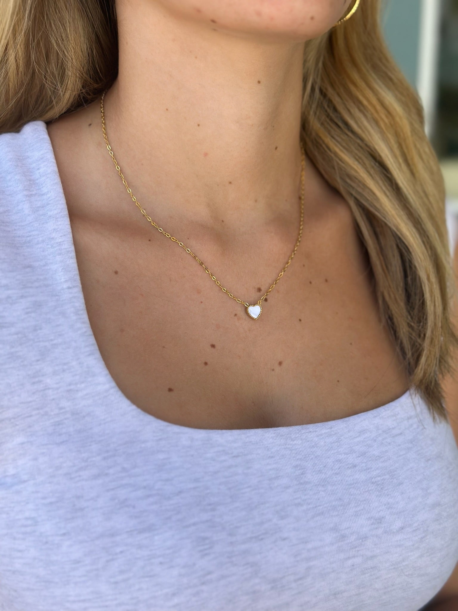 Soft, golden, and full of charm—Ivy is your delicate statement piece. A milky white heart pendant rests on a gold-tone chain with subtle texture and shine, perfect for layering or wearing solo.