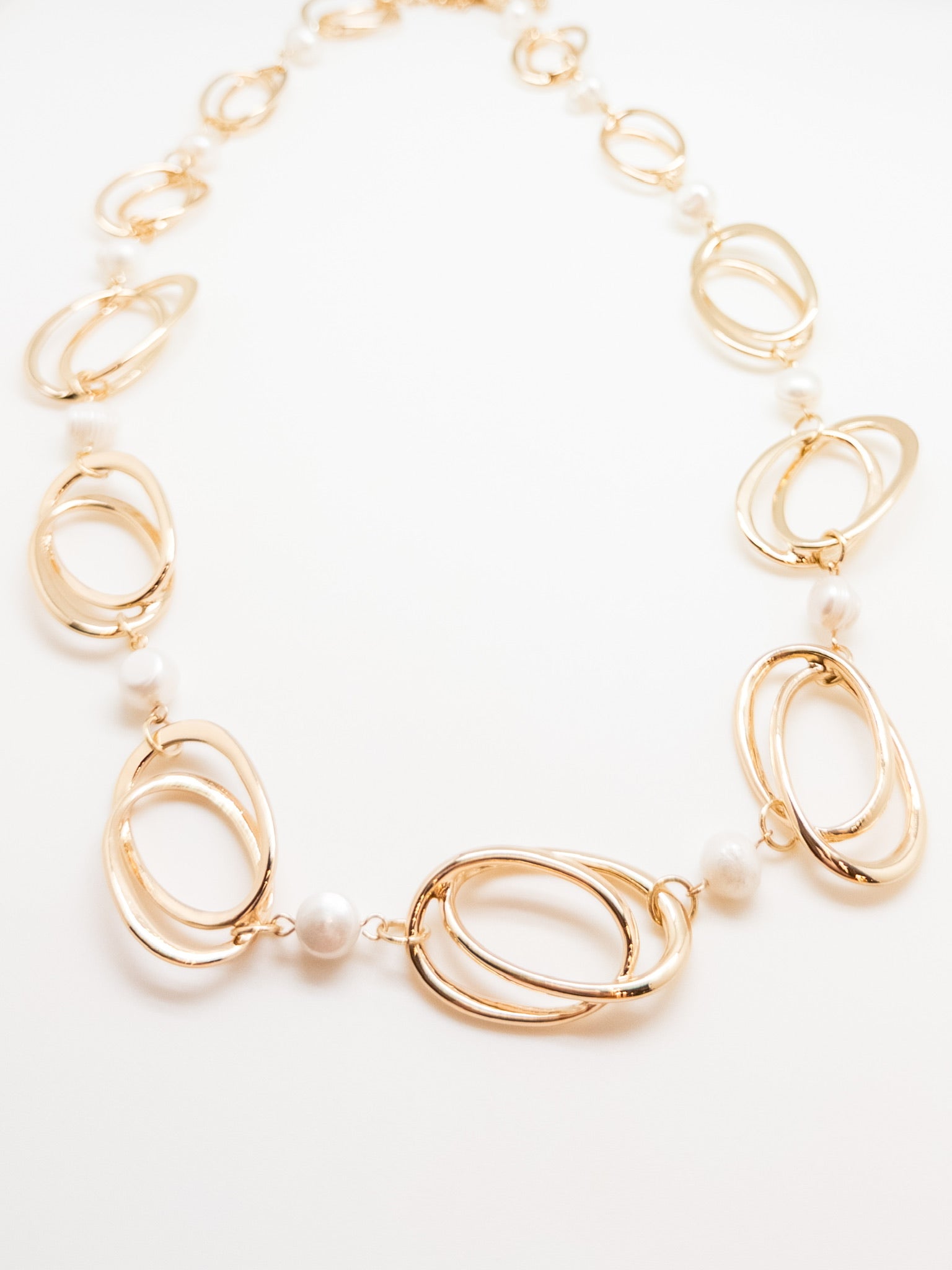 The Leilani Pearl Necklace in Gold is a stunning statement piece that blends modern design with timeless elegance. Featuring interlocking gold-tone oval links accented with lustrous pearls, this necklace adds a touch of sophistication to any look. Its versatile design makes it perfect for both formal events and elevating your everyday style.