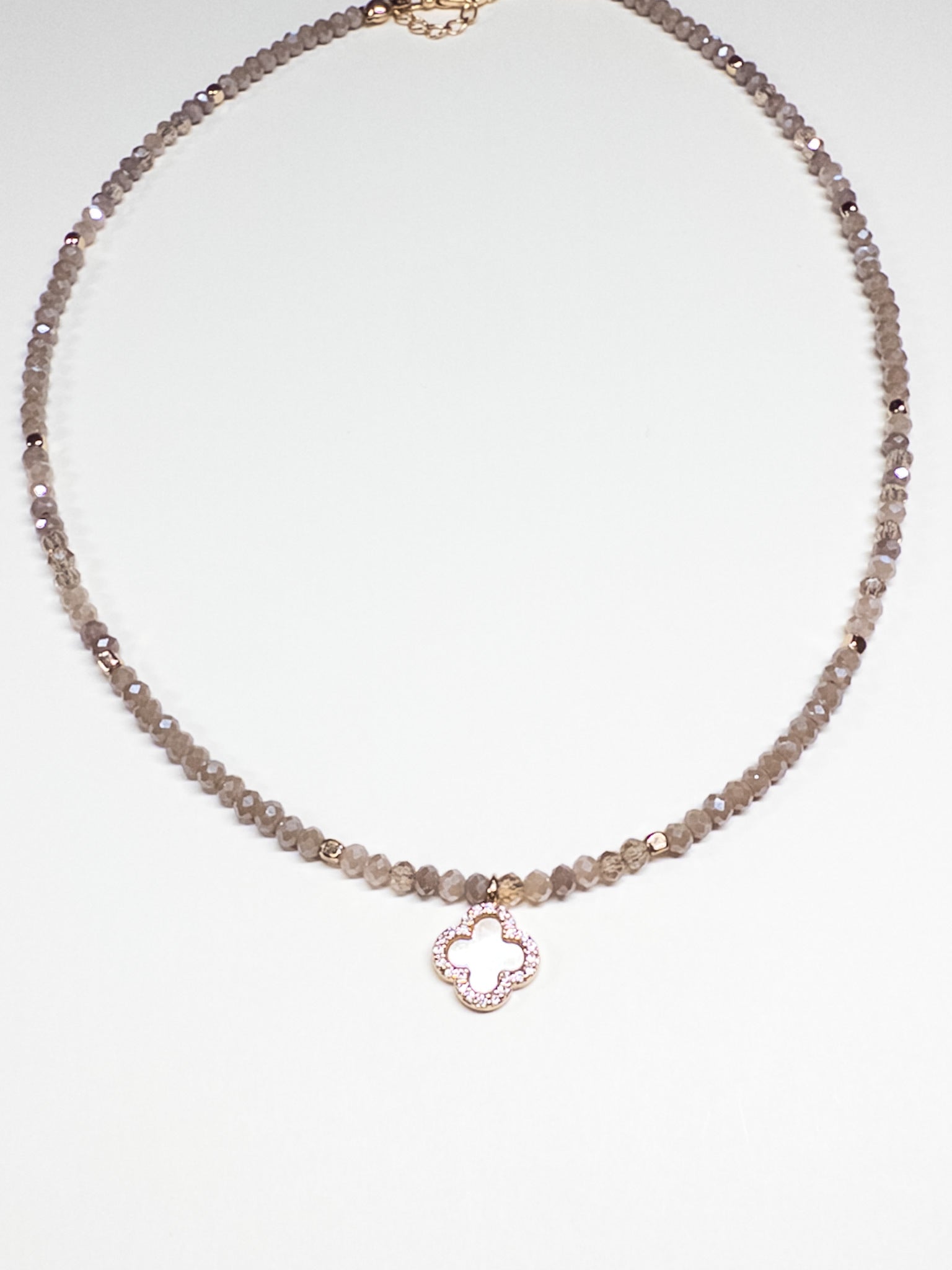 This delicate necklace features small beads in a taupe pinkish tone and a four leaf mother of pearl clover shaped pendant. The overall design is a simple yet sophisticated look perfect for subtle everyday wear.