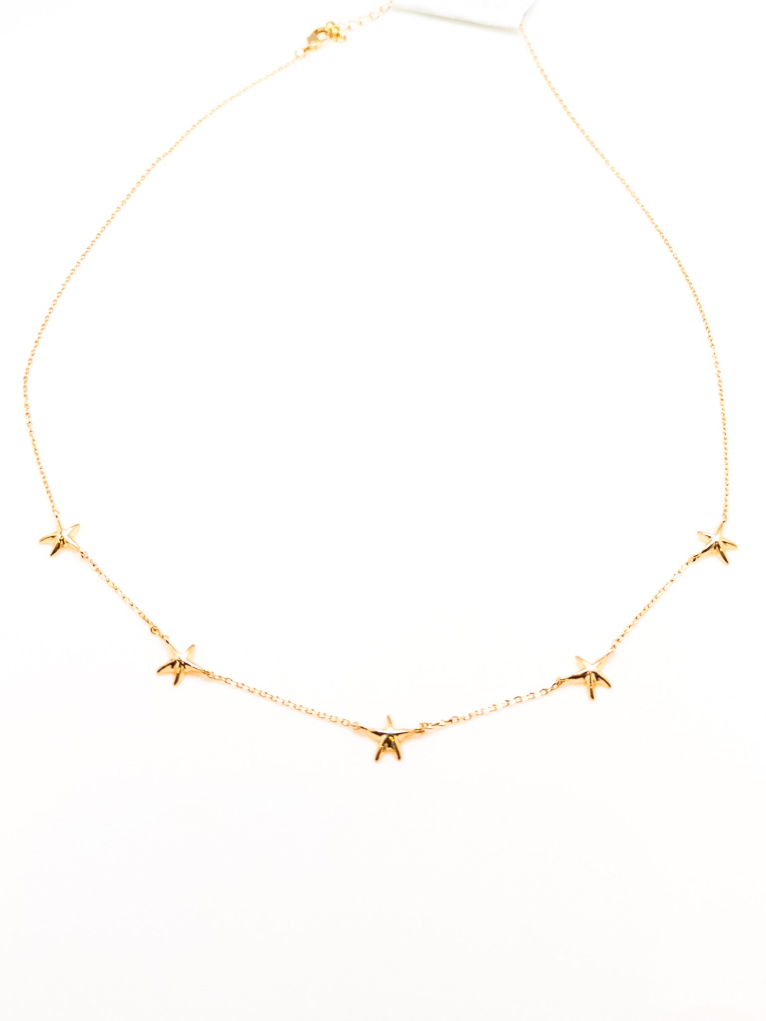 The Oceana Starfish Necklace is a gold plated necklace with small starfish charms, offering a delicate and peachy vibe for a subtle statement.
