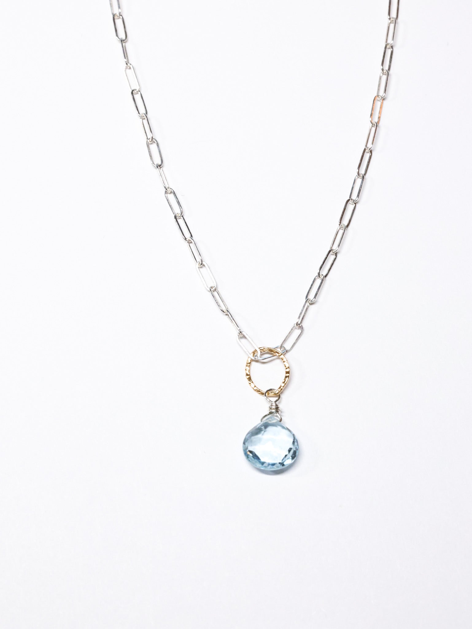 Unit price / perThis simple beautiful necklace has a sky blue topaz pendant on a gold filled drop. 2 tone for maximum versatility, yet subtle.